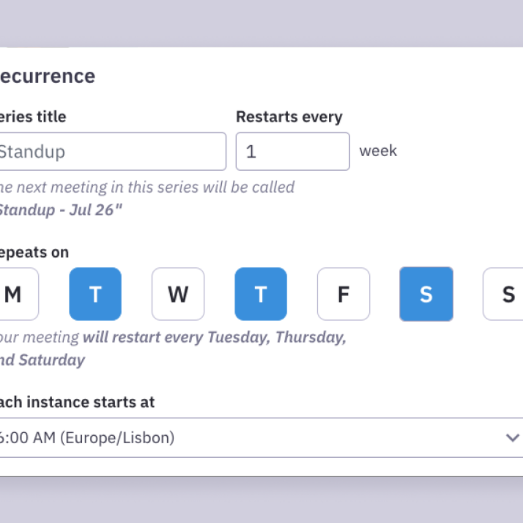Schedule your standups based on the preferred recurrence by your team, or even switch days and times in different weeks, to make sure no one has to repeat their same work status over and over again.