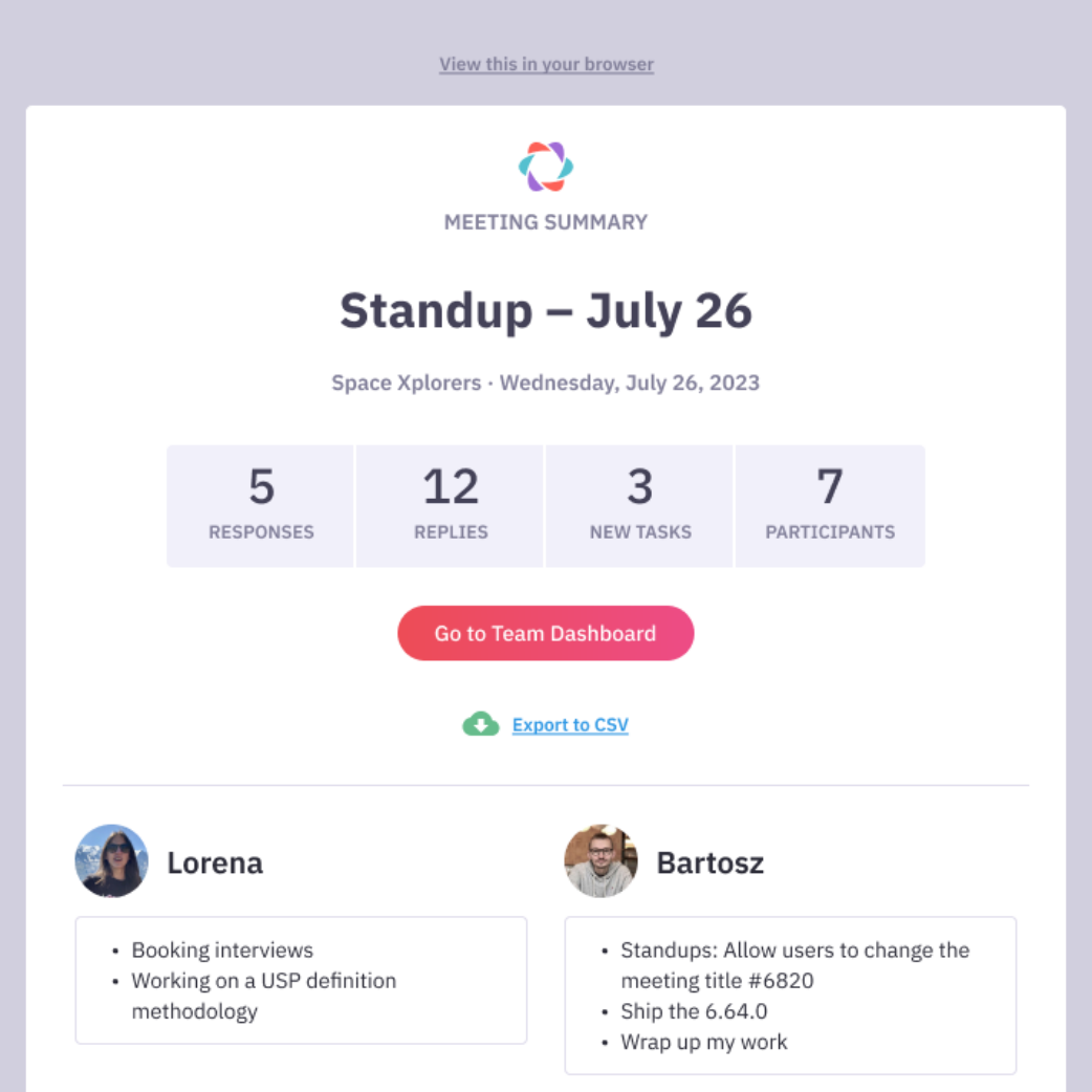 Seamlessly integrate your Standups with Slack, keeping everyone in the loop, even during sync meetings.