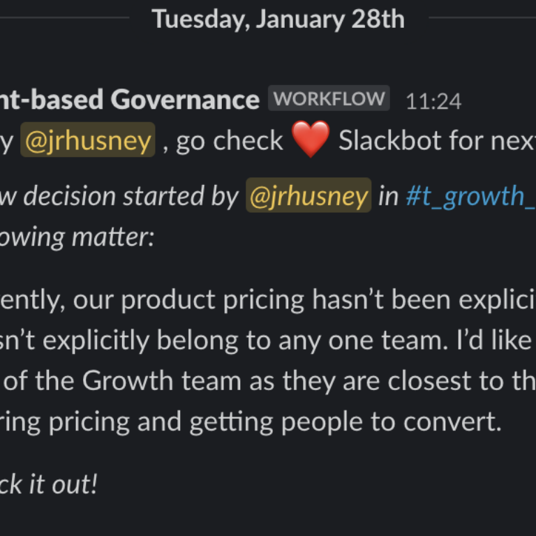 High-performing teams make good decisions quickly. Our distributed team uses this Slack Workflow to make quality decisions fast, even across time zones