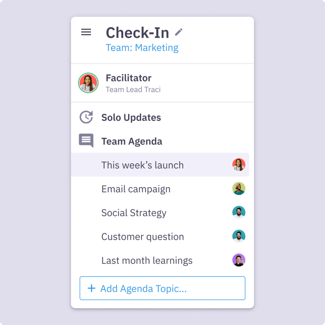 Team Check-in: Start with an icebreaker, then share individual updates on your work. Build a shared agenda, tackle the questions that matter most and resolve issues.