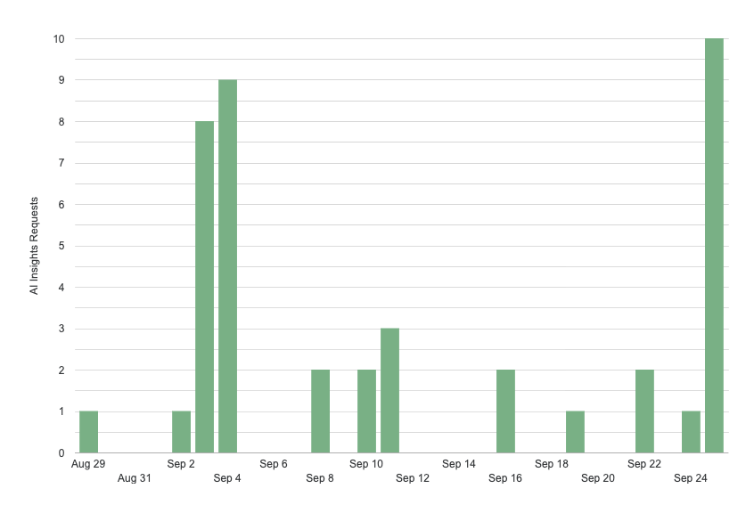 September 25th (yesterday) was the first time everybody could see insights, as can be seen by the above graph. Friday (today) tends to be the day when most users log in. We’re excited to see how this data change and what trends emerge, and learn more about what people choose to use Insights for.