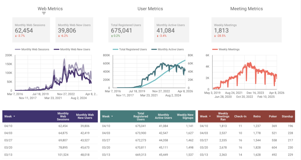 A big dip in retrospective meetings run this week. Curious! All other metrics seem within expectation.